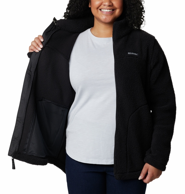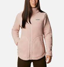 Columbia West Bend Full Zip W er en komfortabel damefleecejakke i 100% polyester sherpa fleece. Jakken har almindelig pasform med en centerlængde på 66 cm. Den er udstyret med en fuldlængde lynlås, lynlåslommer til hænderne, og en brystlomme med krog- og løkkelukning. Elastik ved manchetterne og en justerbar kant sikrer en optimal pasform. Findes i farver som chalk, sort, og dusty pink. Jakken er nem at vedligeholde og kan maskinvaskes.