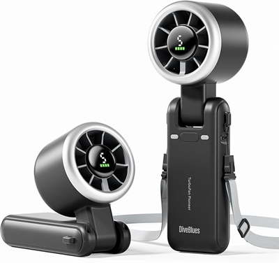 DiveBlues Jetforce High Speed Fan er en kompakt, håndholdt turbo ventilator med fem vindhastigheder op til 9 m/s og en motor, der når 13.550 RPM. Den lette, foldbare konstruktion og LED-skærm kombineres med en 4.000 mAh USB-genopladelig batteri, der sikrer fleksibel brug som både halsventilator og bordventilator.