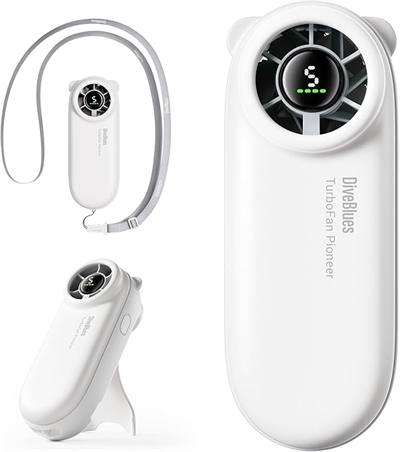 DiveBlues TurboBear White er en kompakt og effektiv turbo ventilator med fem vindstyrker og op til 17.000 omdrejninger i minuttet. Batteriet på 4.000 mAh lades op via USB-C, og den kan bruges håndholdt, om halsen eller på bordet. LED-skærmen viser både vindniveau og batteristatus. Støjsvag betjening.