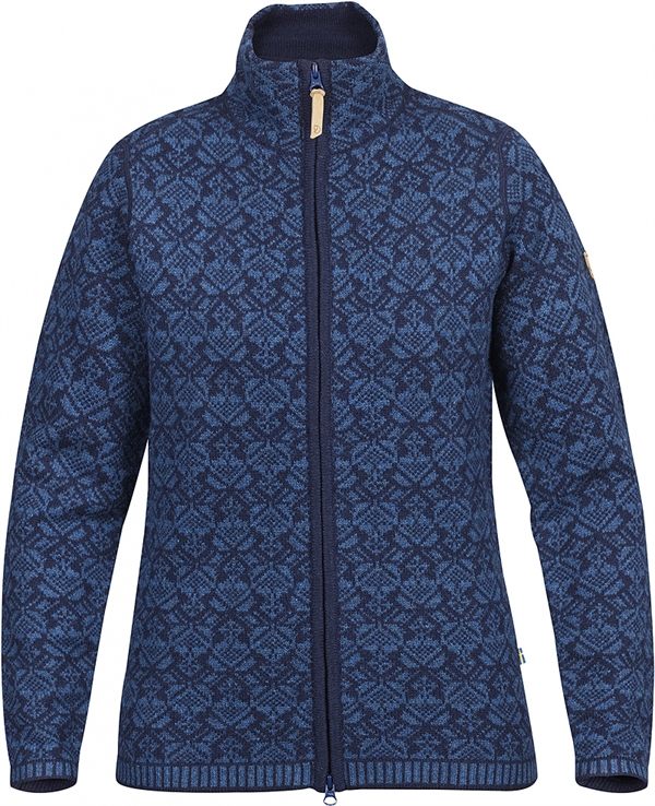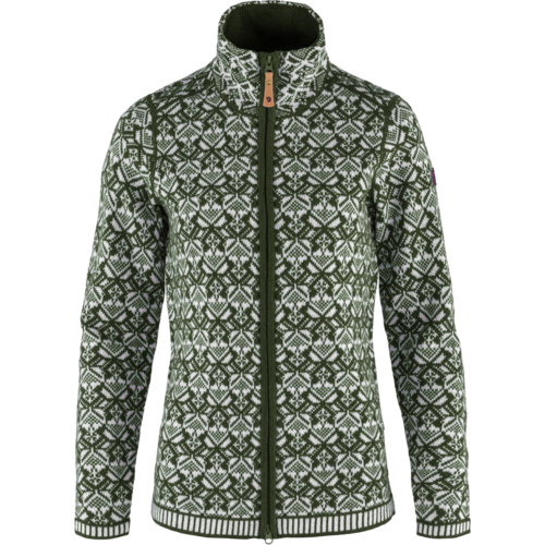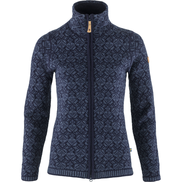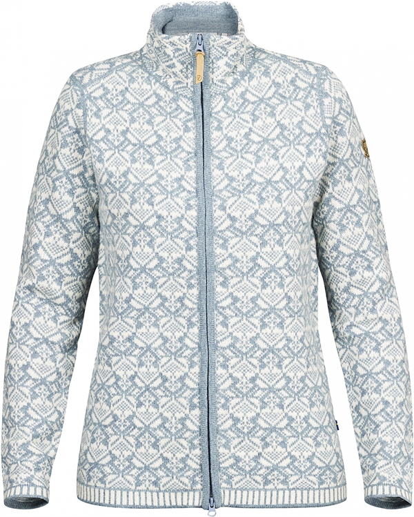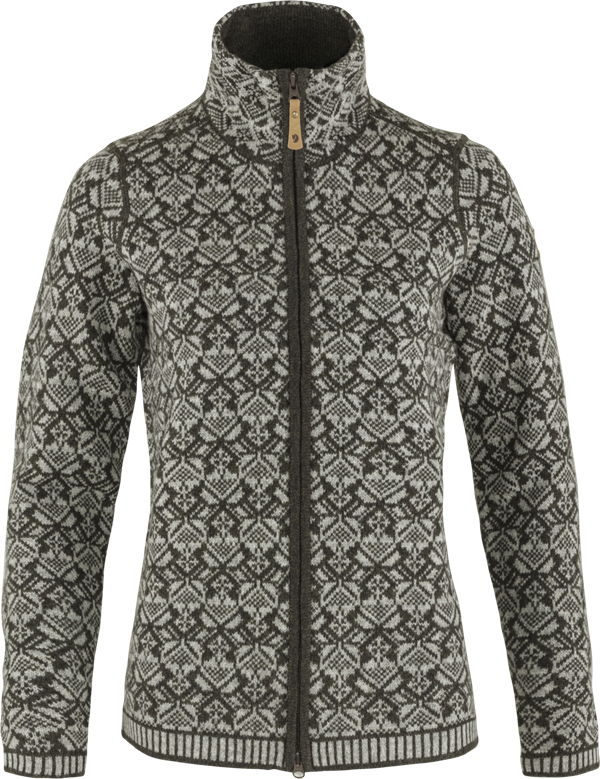 Fjällräven Snow Cardigan W er en elegant jakar-strikket cardigan lavet af 100% sporbar lammeuld. Designet er præget af et smukt mønster inspireret af skandinavisk folklore. Den har en tovejs lynlås foran og en høj stand-up krave. Ideel til vintervandringer og hverdagsbrug.