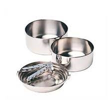 Campingkogesystem med gryder, låg, tallerkener og krus.