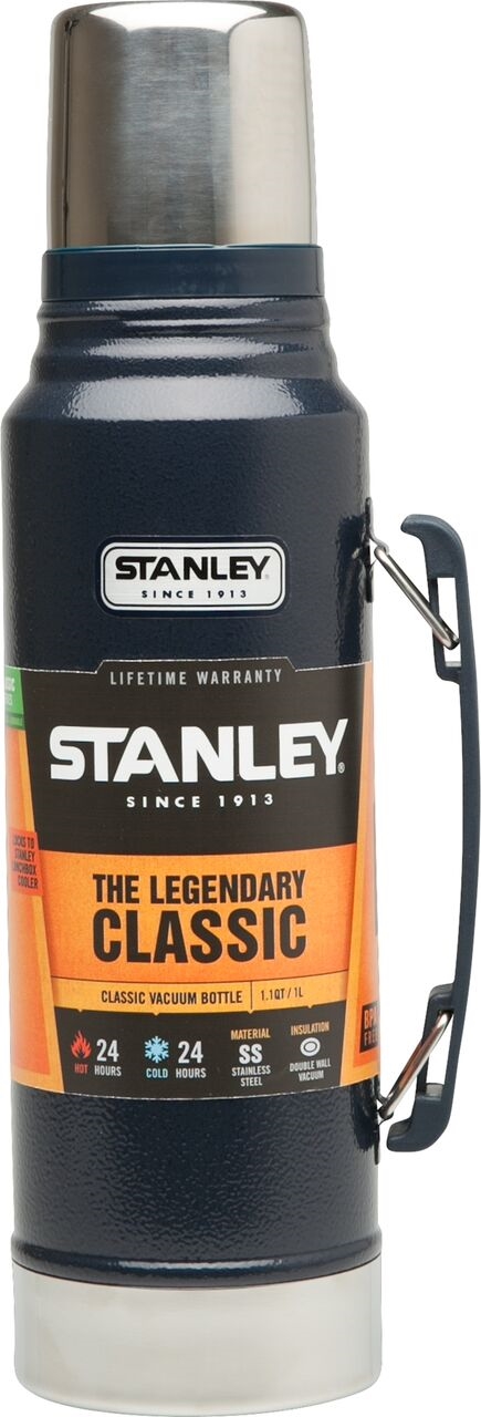 Stanley Classic Vacuum Bottle på 1,0 liter kombinerer holdbar 18/8 rustfrit stål og dobbeltvægget vakuumisolering. Designet er BPA-frit, lækagesikkert og holder dine drikkevarer varme eller kolde hele dagen. Det slanke design muliggør enhåndsbetjening, mens skruelåget sikrer nem hældning. Låg fungerer som en kop, og flasken er opvaskemaskinevenlig.
